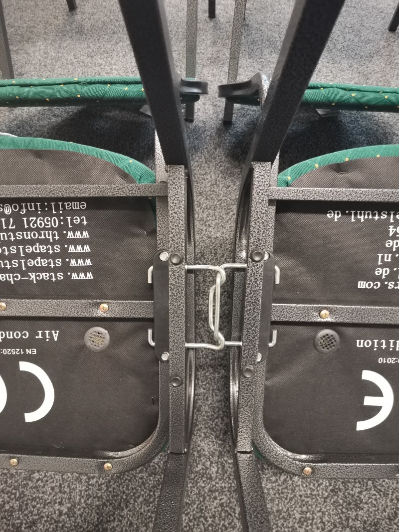 Die hochwertigen Reihenverbinder sind ausziehbar. Bei Nichtgebrauch können die Reihenverbinder einfach wieder unter das Gestell geschoben werden und sind dadurch quasi unsichtbar. Somit sparen Sie sich lästiges An- und Abmontieren der Reihenverbinder. Der Abstand der Stühle durch die Reihenverbinder beträgt ca. 5 cm(Gestell) sehr platzsparend und ca. 9cm (zum Sitzpolster des Nachbars) Das Set wird inkl. 4 Schrauben zur Montage mitgeliefert.